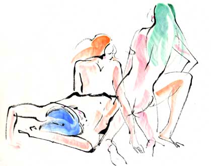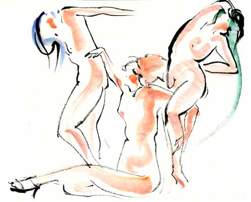 最後は3人よる群像スケッチです。 3人が三様にポーズを決めて 物語を作ります。 最後はバーカウンターに昇り 天井に背中をつけてのポーズ。 これらのポーズ、ひとつ3分で行われました。 色は後でつけた物です。 最後までご覧頂き、ありがとうございました。 また機会がありましたら描いてみたいと思います。 会場 非常口(BAR) 主催 JOさんサイト