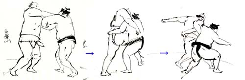 上の絵は、ぶつかり稽古をする白乃波席関と境澤関。
