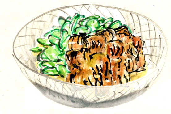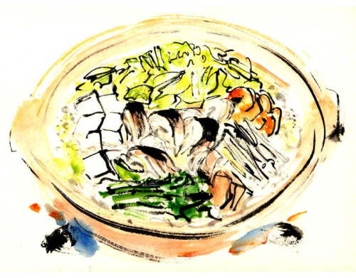 「ヒゲダラ鍋」 描いた料理の中で唯一、食べていません。 ヒゲダラ、いくら魚屋さんに通っても並ばないんですもの 高級魚らしいです。 |