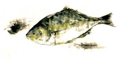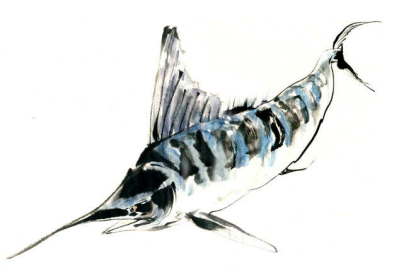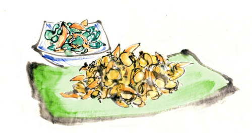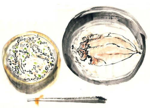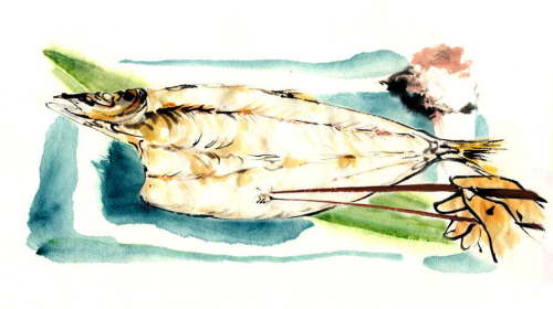 「マカジキ刺身と汁物」 このお仕事をしなければ、およそ口にする機会のなかったお魚です。 淡いオレンジ色の、バターの様な濃厚な身は 実に繊細な脂の香りがしました。 きめの細かいさしの入ったお刺身でした。 実物を知っただけにイラストで表現するのも難しかったです。 |