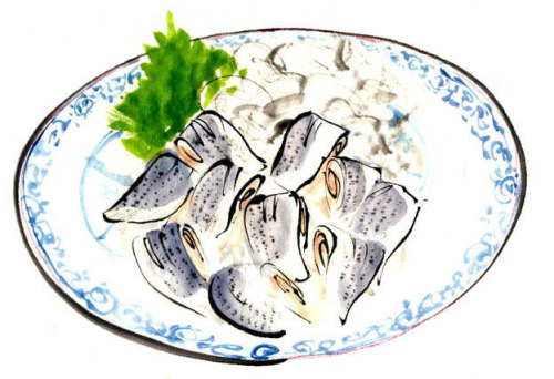「コハダのガリ巻」 写真でなく料理のイラストを使用しているのは 旬の魚は数か月前には手に入らない、と言う理由がありま このコハダもイラスト製作時にどこに行っても手に入らず 想像で描く事になりました。 ほんの数週間後にはどこのお店にも並んでいました。 |